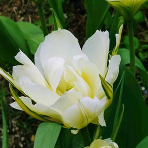 チューリップ🌷ホワイトバレー 超久々ののチューリップです😅小学生以来かも………😱 思ったほどのトキメキが無い。なんでやろ?でもよく見ると、確かに自分の好みのお花やわ😅 チューリップって手間かからないんだねぇ…