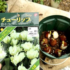ハボタンを抜いて、チューリップにだいぶ入れ替えました🌷🌷🌷 チューリップは年始に福箱企画で箱買いしたもので、品種ごとに黒ポットにぎゅっと詰めて植えてあったものです。 ハボタンを抜いて、チューリップのポットの大きさだけ穴をあけて植え替えます🕳️ ①赤色に白い縁取りが目を惹くタイムレス❤️ ②独特の形のホワイトバレー、実は蕾の時に植え替えで根を半分にちぎったので、心配しましたが、控えめなボリュームで無事に開花です♪ ③中央は、淡い黄色と白がかわいい、カルガリーフレーム 右上は、真っ白シンプルなチューリップ、ロイヤルバージン
