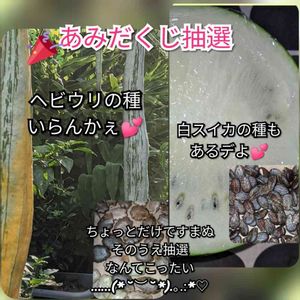 こんばん(*˘︶˘*).。.:*♡わぁ へびうりと白スイカの種いらんかぇ💕 今年は意外に人気沸騰💕 驚きと楽しさと涼しさ抜群です💐 あまり採れなくて、少ないんですが、へびうりは5粒を3名の方に…。 白スイカは10粒3名の方に。 3名以上になりますと、声かけていただいた方を受付順に右からあみだくじにお名前記入し、勝手にくじ引いちゃいます。 コメント欄にどちらか希望の種を書いていただくだけで、あみだくじ作ります。 9月末で締め切らせてね