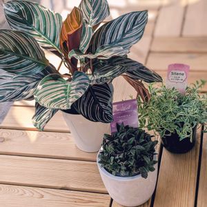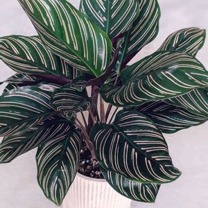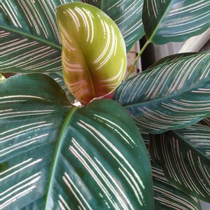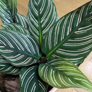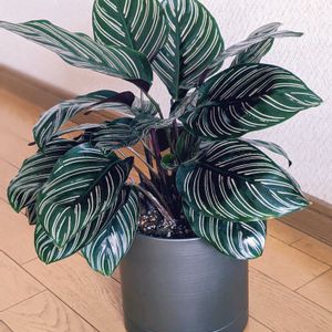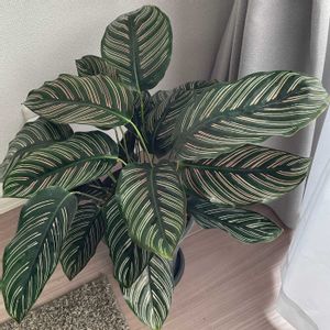 カラテア サンデリアーナ🪴 GS花友さんのpicを拝見し、お迎えしたかったカラテア🚗³₃ 素敵な子に出会えました(* 'ᵕ' )☆ 濃いグリーンの葉っぱに、少しピンクがかった白い絵の具でスーッと模様を描いたような、植物とは思えないような姿💕︎💕︎ 夜になるとくるんと葉っぱ🌿が閉じるのもチャーミングです。