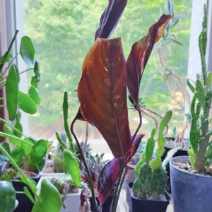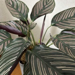 初投稿♡ 昨年末に一目惚れしてカラテアをお迎えしました! 葉の裏側が濃い赤でかっこいいです。日中は茎が広がり、夜になるときゅっと内側に閉じる姿が可愛いです。 寒さと乾燥に弱いみたいで、年末年始に帰省でしばらく不在にする際に耐えてくれるか心配でしたが、無事でした! まずは今年の冬を乗り越えてから、ぐんぐん大きく育ってくれたらと思います☺️