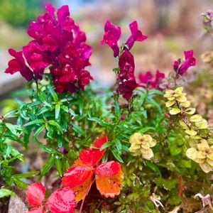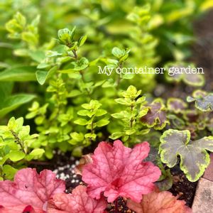 葉色が美しいシモツケゴールデンチャームとピンクの花穂が上がっているヒューケレラの寄せ植えです😊 シモツケの葉の間からピンクの花穂が上がっているように寄せ植えしました🪴 左にコプロスマ、オレガノマルゲリータ。 青い花がタツナミソウです。 ヒューケレラは丈夫なヒューケラとお花のきれいなティアレラをかけ合わせた❌ものだそうです。 お店にある200〜300のヒューケラを並べ直していたら、一個だけありました🤞