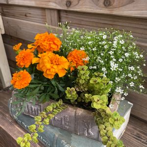 ②枚目です☺︎*ᕷ˖° 本日の寄せ植え📓💝 会社で作っているマリーゴールド🧡と カスミソウ🤍を入れて♪̊̈・゜♡ 今日も①日お疲れ様でした_(⁎ᴗ͈ˬᴗ͈⁎)_
