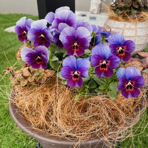 セレクトビオラのぶどう 一目惚れで後からもうひとつ購入し二株植えです。周りにオレガノマルゲリータを寄せ植えに。ココヤシファイバーなくても可愛いんだけどオレガノが寒さに弱いかなーと思い防寒。