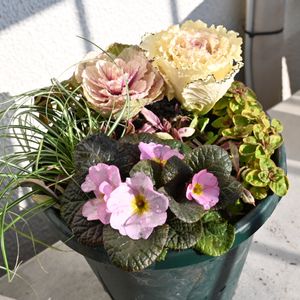 オシャレな葉牡丹が売っていて久々にヤル気がわき、それに合わせて選んで買った苗と先日買ったパンジービオラなどなどで寄せ植えを作りました。 葉牡丹 光子ポラリス プリムラ チョコレート リシマキア リッシー アリッサム クリーム色 ビオラ パンジー オレガノ マルゲリータ 散り斑 グレコマ 葉牡丹のツヤツヤな実感と大人っぽい色合い、プリムラもこれまたシックで素敵。 ビオラとパンジーは100円前後で売っていたノーブランドのもの。こんな可愛いやつがこのお値段でいいの??って2度見しました😅 オレガノは昨年作った寄せ植えの生き残り。グレコマは庭から引っこ抜きました(笑)