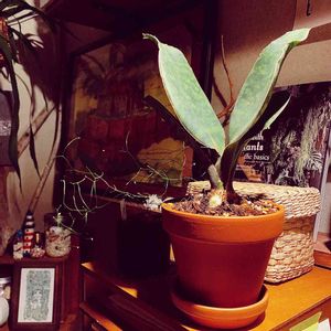 サンスベリアマッソニアーナです♡ 鉢に植え付けたところ、猫に毎晩土から掘り返されて転がっていたので∑(゚Д゚) (わが家の猫、飼い主に似て植物好きです💦) 猫の登れない、棚の上に避難しました♪ 植物ですが、オブジェっぽいので置き物に馴染んでいます(≧∀≦) サンスベリアマッソニアーナ、厚みがあって大きな一枚葉可愛いいです‼︎ 暖かくなったら、成長するように外に出すつもりです。 大きくなあれ〜。