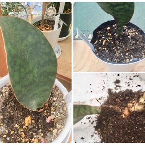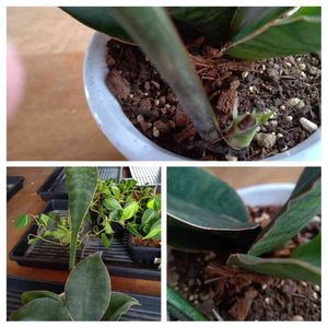 サンスベリア マッソニアーナ ↗️鉢の形が変形😱 ↘️植え替え中😳 ⬅️完了‼️ 鉢が変形している事に気づいて植え替え作業😳 葉っぱ1枚の割には根がゴツいですね😅 鉢を変形させるなんて正に見かけによらずです🤣 他の鉢も子株ラッシュでこの鉢からも子株が出そうです🥰