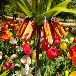 昭和記念公園 チューリップ #12 オレンジ ファン アイク、との声がありましたが、帰宅後ネットで調べても、この様な枝垂れ方はしていませんでした💦 会員の方から、フリチラリア・インペリアリス、と教えてもらいました🤗