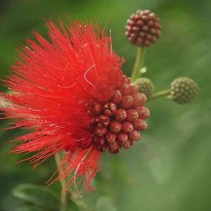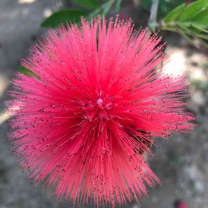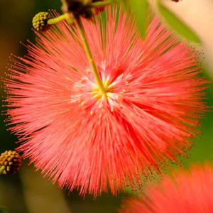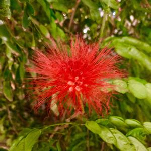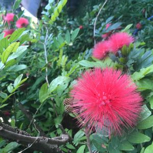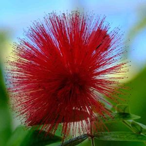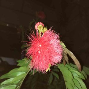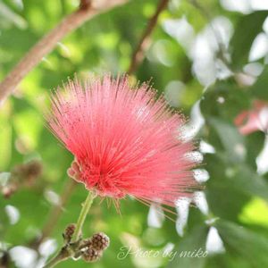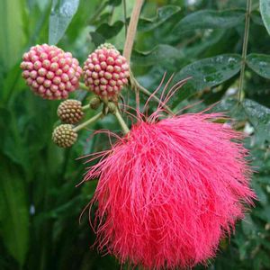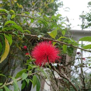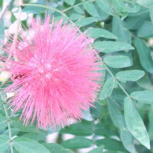 真っ赤なふわふわのボンボンは熱帯性常緑低木の オオベニゴウカン(大紅合歓)の花です 糸状の花のように見えるのはオシベの集合体で 蕾はギュッと縮まってますね 英名:レッド・パウダーパフ 花言葉:「高潔」「澄んだ心」
