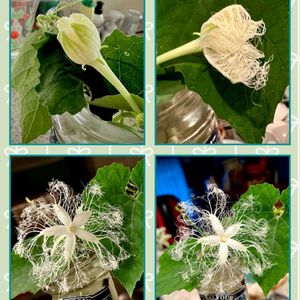 🏷️白い水曜日♡🏷️夜に咲く花 カラスウリの花🤍 崖地にたくさんあるので蕾が付いているのをもらって来ました。 持ち帰る間にくったりしたけど、水に挿したら元気に❣️ 花が咲きました🤍🤍🤍 左上から時計回りに 🕒15:08、17:23、18:24、20:15 家でこんな風に見られるなんて🥰🥰🥰 家族LINEでさっそく送ったら、息子が「クルエラみたい」だって🤭