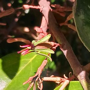 オオバヤドリギ オオバヤドリギ科 オオバヤドリギ属 半寄生常緑植物 今春に初見(25.3.18投稿) 秋の花を見に行きました ①筒性の花 花被は4裂し反り返る 雄しべ4 雌しべ1 蕾は棒状 写真の下部に写っています 果実(今年春)は丸形 花のすぐ上に残ってました ②葉 ③全体像 春よりも拡がっていました タイサンボクに寄生しています 10月中旬撮影