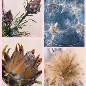 おばんです。 2つ前の投稿のフワフワの綿毛の種のお花がこちらです💕 何とも不思議な植物で南アフリカ、オーストラリアに生息している植物です。 左上の蕾から下になり、右下のフワフワ状態に徐々になつて行き、種が持ち上がって来て下にポトリと落ちていました右上。 タンポポの綿毛の様にきっと風に乗って種を目的地まで運んでいくのでしょうか? 我が家で育つのかどうか分かりませんがやってみますね🤗