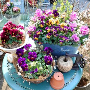 鉢増しを兼ねた寄せ植え完成! 八重のパンジーも次々と咲いてきて後ろに入れたカレンデュラが咲いたら可愛いだろうな〜😌