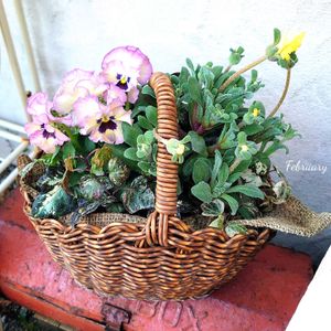 プリムラベルベットドレスを使った寄せ植えをつくってみました🧺 とても立派な苗なのにお手頃価格で思わずカゴに。。ビオラも60円以下。 お財布に優しい寄せ植えです😆