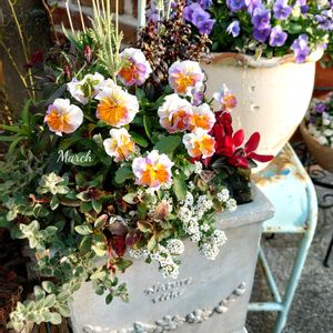 花数が増えて賑やかな寄せ植えを🤳 このビオラは色変わりが美しい✨