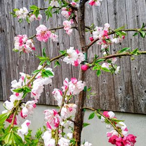 花桃 ピンク、赤、白と 枝垂れ花桃源平が咲き揃ってきました 鉢植えで高さ1.5~2mぐらいだけど 散歩するご近所さんも楽しみにしてくれてます