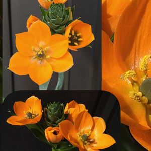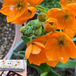 ☘️オーニソガラム[ダビウム]☘️....いきいきとしたこのオレンジ色が以前お庭に映えていたんだけどなぁ💕あたしの過湿が原因か、残念、絶えてしまったみたい😰💦でも後もうひとつ[オーニソガラム・アラビカム]の白花が隣の鉢植えにあるの。うまく咲き出してくれるかな?左下は主人からお嫁さんにお返ししたホワイトデーのGODIVAチョコ。お嫁さんから今開けて味わってまぁすって写真が来たよ😍✨✨