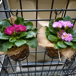 11月24日に購入してた、プリムラ・ジュリアン達、初めてのお迎えです😊 庭のフェンスに、セリアで買ったフック付きのアイアンの網型鉢?に麻布で土が落ちない様にして、ハンギングしました😊 pic5 庭のフェンスの様子です😊