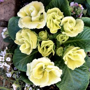 プリムラ・ジュリアンのバラ咲きジュリアン品種のクリーム色の花 2022-12-18