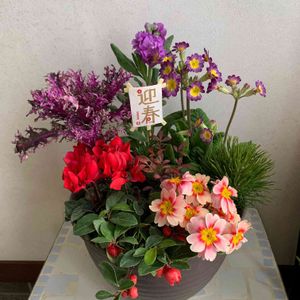 「プリムラ・ジュリアン」の寄植えに出合えました。 パチリ お花が大きいのが「プリムラ・ポリアンサ」、小さいのが「プリムラ・ジュリアン」なのだそうですが、最近、大きなお花の「プリムラ・ジュリアン」が市販され、見た目では区別がつかないそうです。 今回は「プリムラ・ジュリアン」とさせていただきました。