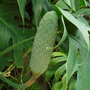 Fruit of Monstera モンステラの実を、初めて見ました。ほぼトウモロコシの実と同じサイズの大きな実でした。 実が出来るためには、当然、その前に花が咲くはずです。そこで、ネットで調べてみると、白いミズバショウの様な花が咲くそうです。この実の大きさから想像すると、かなり大きな花が咲くはずです。ネットの写真では、ほぼ葉の大きさの花が咲いています。見てみたい。 出来た実は、食べれるそうです。wikiによれば、鳳来蕉:Monstera deliciosa の実は、パイナップルとバナナを混ぜたような味がするそうです。Monstera deliciosaの意味は、美味しいモンステラになるらしい。 トリビアの連続です。植物は、知れば知るほど奥が深いという感想を持ちました。 P.S. モンステラは、サトイモ科に属するので、サトイモに花が咲くのか、調べてみました。やはり、ミズバショウの様な花が咲くそうです。10年に一度の珍しい花らしい。うちで栽培しているサトイモに万が一花が咲いたらアップします。ここで、カーラ、モンステラ、ミズバショウ、サトイモの花が似ている事がサトイモ属に属する事で繋がった。トリビアだぁ〜。 今日は、フザケなしで書いてみました。自分でないみたい…。🤔🤨🙄