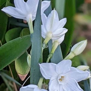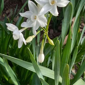 我が家の水仙❣️ 木の下から、ニョキニョキとニラみたいな葉が出てきたなぁって思っていたら、白い蕾が膨らんで、あっという間に次から次に咲きました💕 調べたら“ナルキッスス・パピラセウス”ってヒットしたけど、合ってますか❓ ペーパーホワイトとして知られる数少ない種の1つだそうです💕