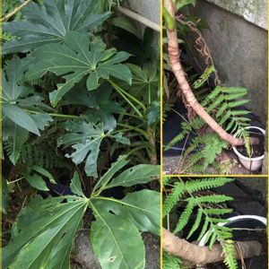 お隣の木戸を開けると大きなヤツデが 有ります。株元を見ると10センチ程の 鉢から伸びています。 その中に根が収まるわけはありませんよね😆土の上に置いてあるので根が穴から地面に伸びて行っているはず! 面白い姿です😄