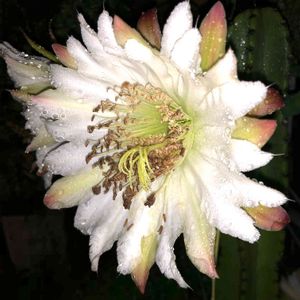 12時に帰宅して物干し場ガーデンに見に行きました。 四つ咲いていました❣️ 大雨で濡れながら撮りました! 鉢を移動したらサボテン🌵が倒れて来て 顔で受け止めてしまいました。😣 真っ暗、大雨!散々でした😢