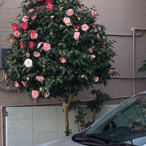 買い物途中に素敵なツバキの木があります。 一本の木からいろんな色合いのお花が咲いています❣️