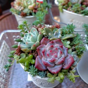 ①②ミニポット寄せがだいぶ落ち着いてきました。色合いも少しずつシックに。 化粧品店の飾り棚用にはこの2つをお届けしようかな。 飾り付け🎄🎅🌟して、ヤバッどんだけ可愛いの🩷?親バカ🤭 ③こっちの2つはまだ少し日がかかりそうなので、はなままの手元で育てます😊。