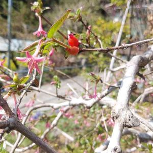ウグイスカグラ 随分と気が早い。周りは花を咲かせていたり蕾の状態なのに、もう実を着けて赤く熟してます。