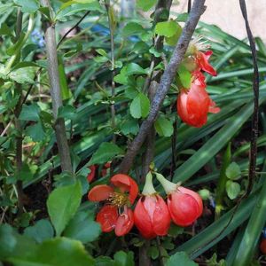 クサボケ 2年前の伐採現場に沢山生えていました。土地開発で重機整地される前に救出してきました。雑木林の中で薄暗い場所に生えていた為花が付いてませんでしたが、日当たりの良い場所に植えたら今年初めて開花してくれました。
