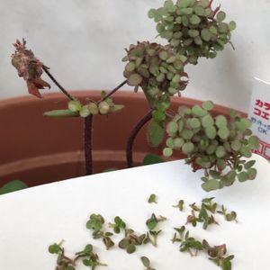 カランコエ、紅提灯です。 蕾付きを購入したものの、環境が変わったせいか、蕾がヨレヨレになり咲かずに終わったまま放置してたら、花房から子供がいっぱい!何だこれ。何で種ではなくて子株? 白紙の上に乗ってるのは、左端の花房をバラバラにした子達です。 あと3房、すごい数になる。 この株は新芽が出て来て元気です。