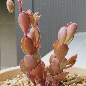カランコエ・リンリン、少し紅葉。 一枝挿し穂用に置いてたら、U字な感じで 根付きました。 切り口の辺りからも枝が出ました。