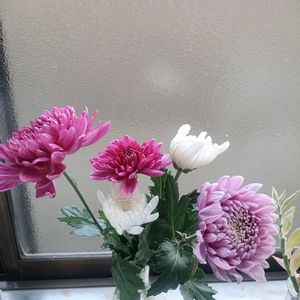 今晩は😊いつもの花屋さんで素敵な大きな菊の花を格安でゲット😍👍 なんと一本200円でしたー🤗💕その他リューカデンドロンやリースに使うリーフなどを購入しちゃいました🥰