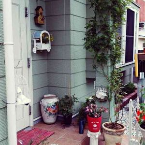 今朝の玄関風景です。柱に巻いたつるバラ「リトル・ルチア」中央から下部と「アイスバーグ」(上部)には、花芽が沢山付いています。待ち遠しくてたまりません。