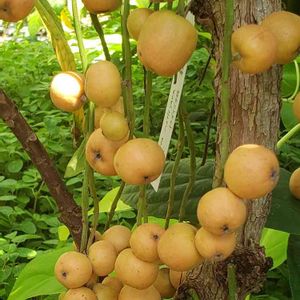 ランバイ 昨日の沖縄市大植木市にて、この果 実は初見です。原産地はマレー半島 からスマトラ島です。(*´∀`)♪❣️ 太い幹から紐状に3cm前後の球形の 果実を無数に垂らす様子は非常にユ ニークであり「アジアのジャボチカ バ」のニックネームを持つ。(๑˃̵ᴗ˂̵) 果実は黄緑色からオレンジ色に熟し 白色の果実は甘酸っぱく東南アジア ではごく一般的に売られています。