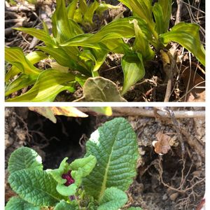 😱😱トラブル続きです(´⊙ω⊙`) 上:雪は降らないけど寒すぎて、ホスタの葉が凍みてます🥶🥶🥶 下:プリムラベラリーナ💕が咲き出しました🎶 上に二つの穴が〜〜🙃😡💢 危うくセーフ‼︎🤭 モグラかネズミか🐀今年は🕳が多い😰 (葉が白いのは陽射しですよ)