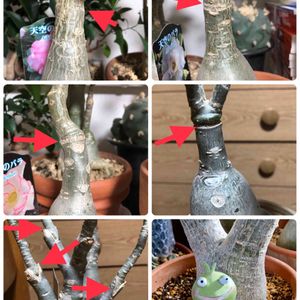 わが家のアデニウム の接ぎ木状況🤗 (接ぎ木で販売されてた状況) 「ほとんどわからない」から「お、おう…💦」までいろいろですが、共通しているのは『接ぎ木ゾーン』より下で剪定してはいけない❗️ということです😊 アデ子の根元はサービスショット💕
