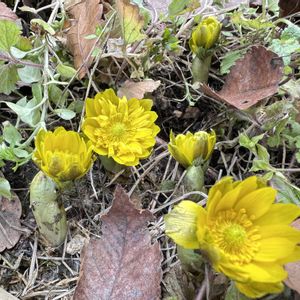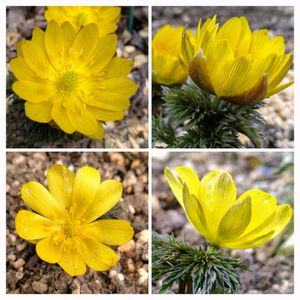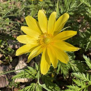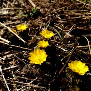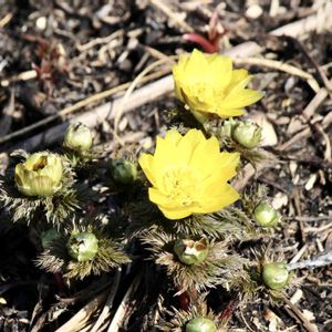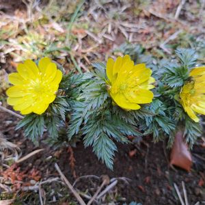 フクジュソウ 隣家の敷地でフクジュソウが満開だということで出かける🟡 午後遅くに行ったので少しすぼみかけているけれど、1茎に3輪ずつ、2株並んで、見事にたくさんの花が咲いていた✨ 葉は無毛、萼片が花弁よりも短いので、ミチノクフクジュソウかなぁ(๑´∀`๑) フクジュソウにも変異があり、茎を切って中空か詰まっているか確かめるわけにはいかないので、外面からの観察だけれど(^_-) 日曜日にビタミンカラー!🏷 暖かくなりましたね☀ 良い一日をお過ごしください♬