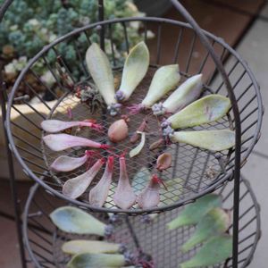GW留守してた間に葉挿しっ子達が更に成長していた❣️ もう名前は分からなくなってるけど🤣 写真用に並べたけど、普段はこの100円網棚にポンポン乱雑に置いてしまってて。次からは整列させてあげよう😊