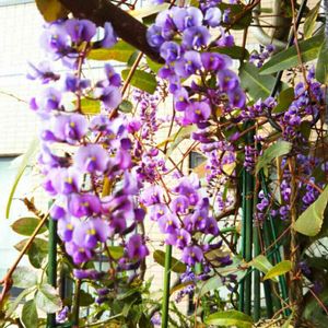 こんにちは🌥 ハーデンベルギアのパープル💜と 舞姫💟を寄せ植えしました💕 窓にハンギングしてみたら❣️ 小町藤が枝垂れてるところが💜 より素敵になりました💟💜😍 可愛い❤️