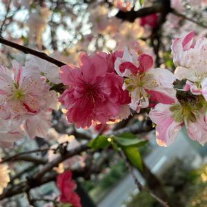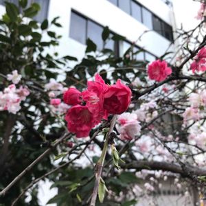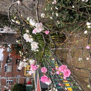近所の街路樹の枝垂桃。 1本の木に3色もの花が咲いている木もある^_^