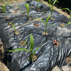 ダイソーで買ったとうもろこしの種が100パー発芽してる❣️大きく育って欲しいなぁ🌽最初から穴あきマルチを敷いたので、空いてるところにレタスミックスの小さい苗を植えました🥬
