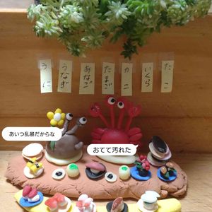 カニくんのおててを汚したのは私です😅 お詫びに回転寿司です。 お祭りの時にカニくんにアイスを持たせるため、ボンドを付けて一時的に固定したせいで汚れてしまいました😅 ごめん、二人とも。 カニくんは高いお皿ばかり🤭見かけによらずお皿をたくさん積んでいます。 カニくん振り向かないでね、お品書きを見ないでね😅