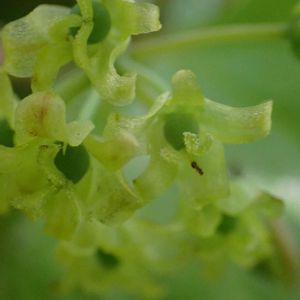 ①カクレミノ ウコギ科 カクレミノ属 両性花と雄花とがあるそう 両性花の下部には大きな子房があります 両性花が既に果期に入っているものが多いように見えます。 ➁この写真でも両性花のみのよう。 ③両性花