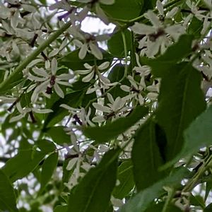 遠くから見ると紫色に煙って見えるセンダン 一度覚えるとあちこちで見るようになります。この木は公園の木。 木の背が高くて、花を間近で見ることは少ないですが、これは身近に見られる木。間近で見ると花弁は白くて、雄しべが紫色。 センダン 別名アフチ、トウヘンボク センダン科センダン属