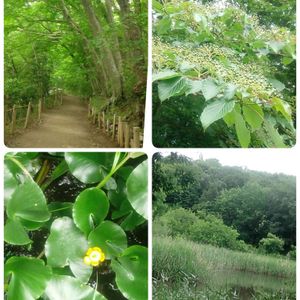 北本自然観察公園出会った植物③ー① 昔ながらの自然をそのまま活かし、野生の生き物がすみやすく、観察や散策も楽しめる公園です 左上 新緑の散歩道(北里の森) 左下 コオホネ 右上 クマミズキの実 右下 ヨシ(高尾の池)