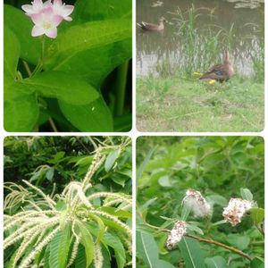 北本自然観察公園③ー② 左上 ミゾソバ 日本全国の小川や沼沢地、湖畔などに生育する一年草 左下 クリの花 右上 水鳥(カモ?) 右下 柳絮(りゅうじょ)綿毛のついた柳の種 風に舞う初夏の雪