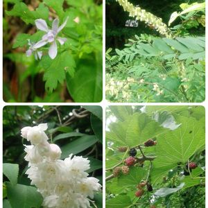 北本自然観察公園③ー③ 左上 セリバヒエンソウ(明治時代に入ってきた中国原産の帰化植物) 左下 ウツギ 白花八重咲き (山野に自生日本原産) 右上 クララ(草地に生えるマメ科の植物 名前は根を噛むとクラクラするほど苦いことに由来) 右下 桑の実(葉はカイコの餌として栽培されている、実は美味しいです)